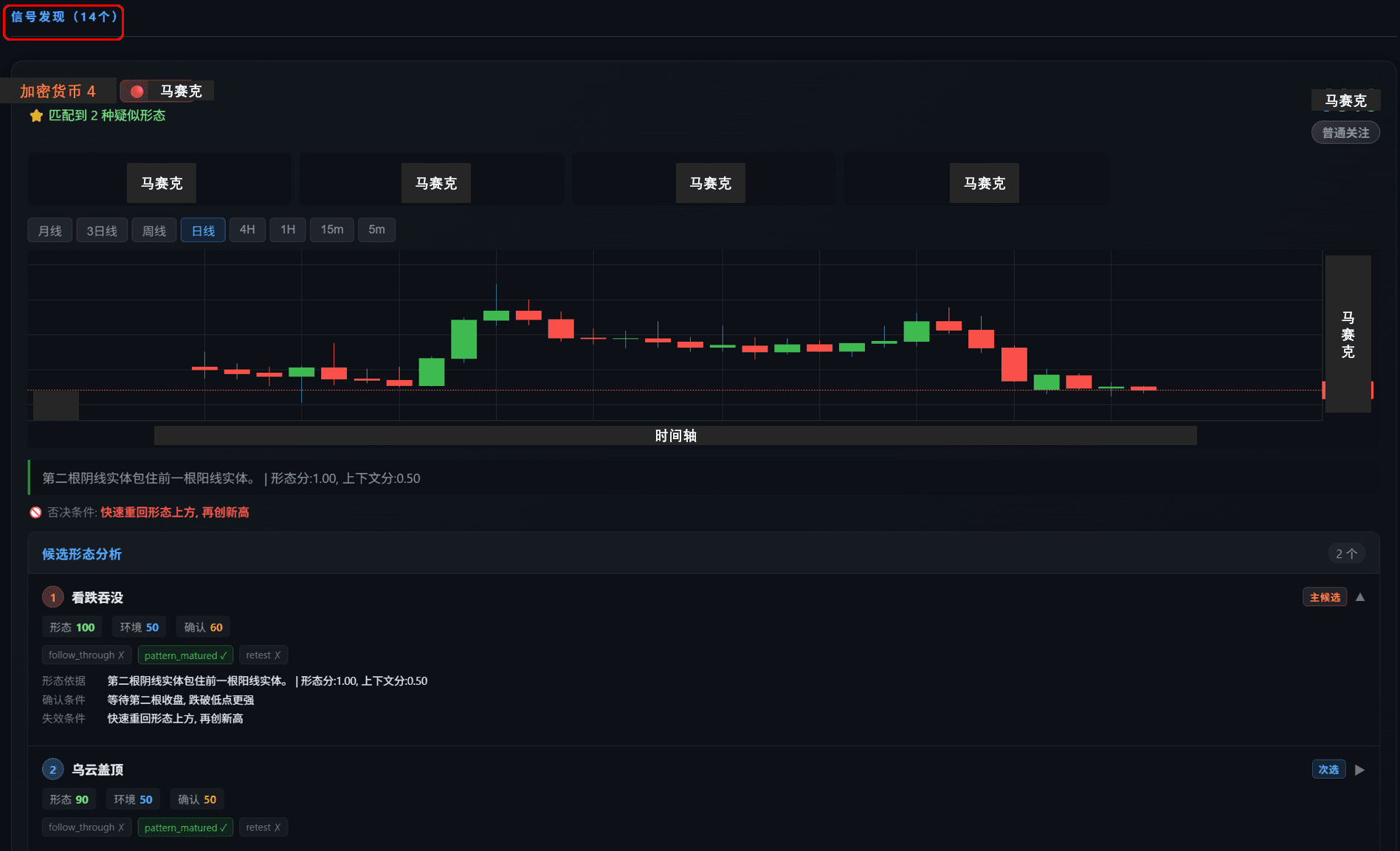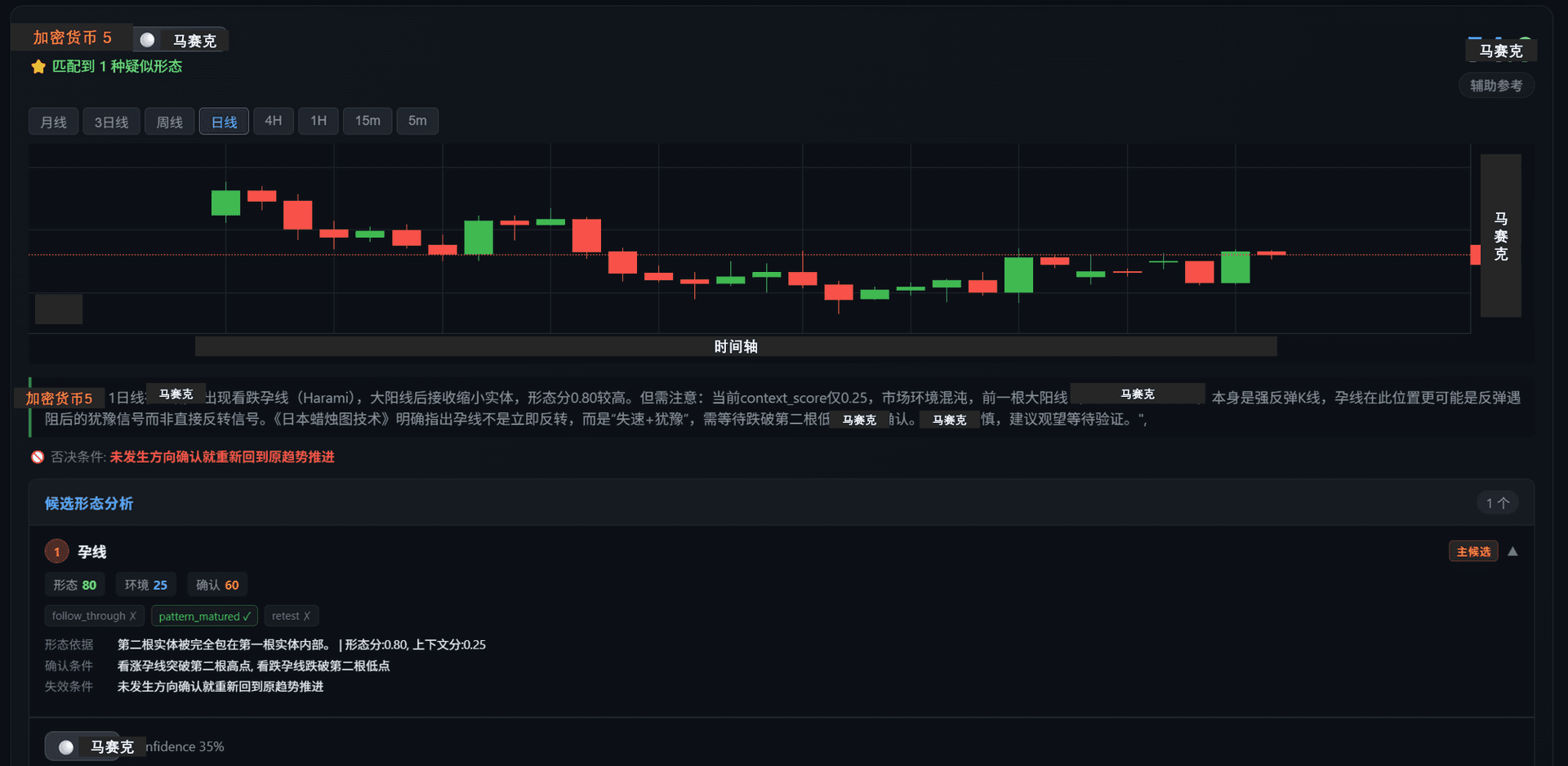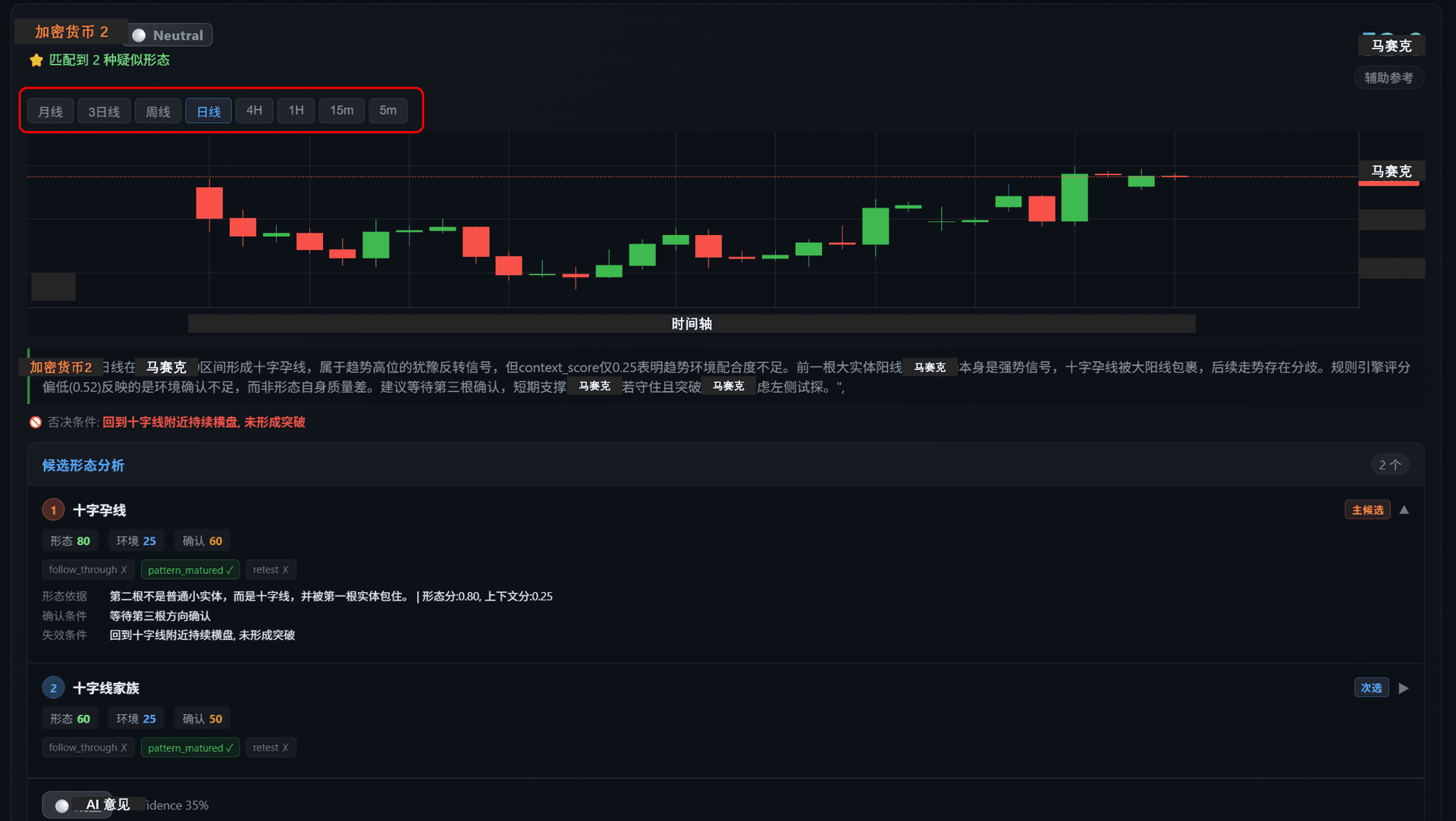 卡片下方的候选形态模块用于展示当前 K 线可能对应的蜡烛图形态,并给出该形态的判断依据、确认条件和失效条件。